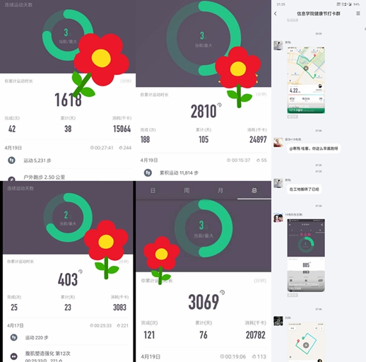 近日,信息学院各级学生组织同时发起“调整作息、运动打卡”的号召,为迎接返校学习做准备。通过号召,各级学生组织建立了运动打卡群,有百余名同学们加入了运动打卡的队伍,更有不少同学们因为有此结伴鼓励的力量,调整作息,早起锻炼。同学们表示,开学在即,想以最饱满的状态投入到这次特殊的返校学习中,用实际行动为“战疫攻坚”发挥应尽力量。