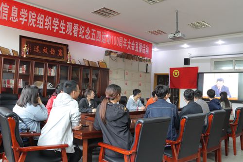 信息学院组织学生在信息学院113观看纪念五四运动100周年大会直播。