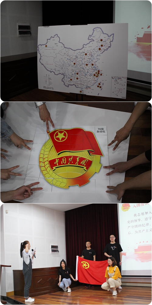 会议的开始,全体同学起立,请团旗,奏唱团歌,并跟着主持人重温入团誓词。今年是新中国成立70周年,也是决胜全面建成小康社会的关键之年,与此同时还是五四运动100周年。至此主持人邀请台下的胡文康、皇甫皓宁等五位同学将自己的团徽贴纸贴在了地图上,并给大家讲述了在这改革开放的70年来,科技给他们的家乡、我们的社会带来了翻天覆地的变化,表达了对祖国的未来的衷心祝愿。讲述结束后,大家开展了团徽拼图和放飞科技梦的活动,支部干部代表班级同学完成团徽拼图,寓意班级将团结协作讲团工作越做越好。同时,同学们在空白的风筝上绘制自己的科技梦,DIR自己喜爱的风筝,现场邀请同学讲述自己的科技梦想。