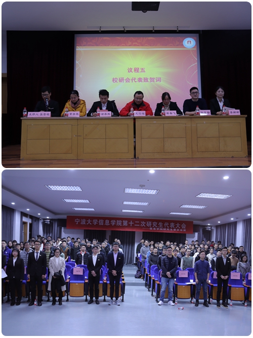 12月13日晚,信息学院第十二次研究生代表大会在曹光彪信息楼5楼报告厅成功举行。学院副院长王伦耀老师、党委副书记屠春飞老师、学工办主任孙文静老师,E-青年工作室主任黄青年老师、十一届研会主席团李娜娜同学、各兄弟学院研会代表和信息学院150名研究生代表出席了大会。