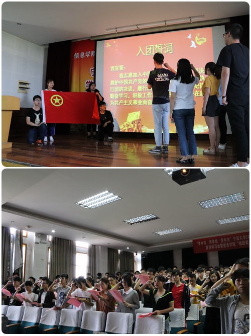 活动在响亮的团歌合唱声中进入高潮,奏唱团歌后,在主持人的带领下,团员们进行入团宣誓环节,重温入团仪式,并由学院老师为团员代表佩戴团徽。接着,马克思主义学院理论宣讲团郝嘉瑜进行了激情的宣讲,鼓励信息学院团员青年要以有理想、有本领、有担当的奋斗姿态去迎接新时代、开创新时代,创造幸福。