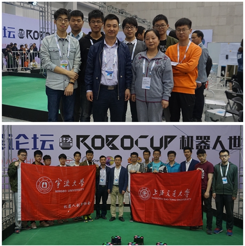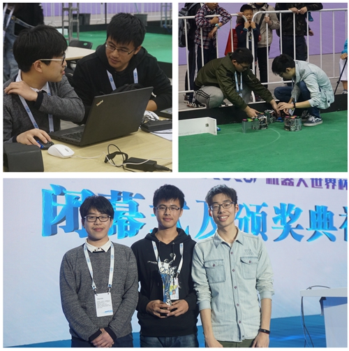 两支队伍在小组赛中就表现优异,都以小组第一的成绩提前出线。淘汰赛中,投石队遇到了此次比赛中最强劲的对手——上海交通大学SRC队。但我方参赛队员沉着冷静,机智应战,率先获得一分。对方及时请求暂停,更换策略,于上半场快结束时破门得分,双方持平。比赛也迅速升温。下半场时,我方在尝试多次跑位后,首先进球,夺得一分。对方也不甘示弱,连发两个角球先后夺得两分,实现反超,此时离比赛结束只剩15秒,我方及时请求暂停,更换策略,在终场哨响前成功破门,将比分扳平。此时,场外的观众热血沸腾,参赛队员的心弦也都紧绷着。进入加时赛后,双方仍旧不分上下,最终进入点球大战,我方最终以1球之差惜败。而另一支问路队则一路过关斩将,顺利杀入决赛。