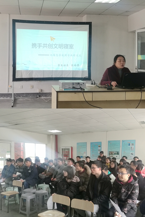 3月22日,信息学院学工办组织了文明寝室建设专题讲座,邀请学社社区服务中心副主任陈玲琴为同学们作了“携手共创文明寝室—与信息学院同学交流会”的讲座。信息学院院长助理(负责学生工作)严水英、相关辅导员、各班级班长、生活委员参加了讲座。