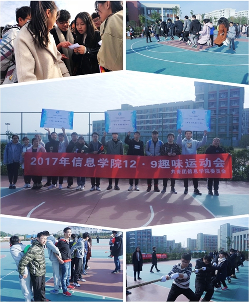 信息学院团委主办的一二.九趣味运动会顺利开展。本次一二•九趣味运动会以“不忘初心,砥砺前行”为主题,紧紧围绕团员青年践行十九大的初衷,开展中共十九大知多少(问答环节),传递中国梦(传递洋葱圈),夹着梦想前行(夹球跑),跳跃历史的鸿沟(跳大绳),不忘初心跟党走(绑腿跑),红线落谁家?(拔河比赛)六项趣味运动项目。
