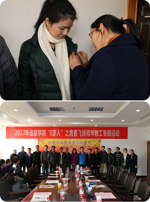 本次活动分为二个阶段。第一阶段,举行了2017年新引进教师佩戴校徽仪式以及新教师争做“四有教师”主题教育宣誓仪式。学院组织这样的专题活动旨在:其一是在习近平总书记提出的“四有教师”的新要求下,我们信息学院青年教师要坚持“四个相统一”,做好学生的“四个引路人”,争做党和人民满意的好老师;其二是sm调教
