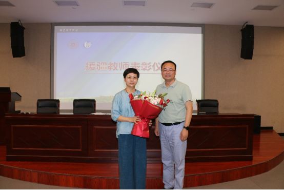 会上,还表彰了刚援疆回来的陈叶芳老师,她因援疆期间优异的表现被新疆理工授予“杰出贡献奖”,充分肯定了陈叶芳在援疆期间取得的成绩。