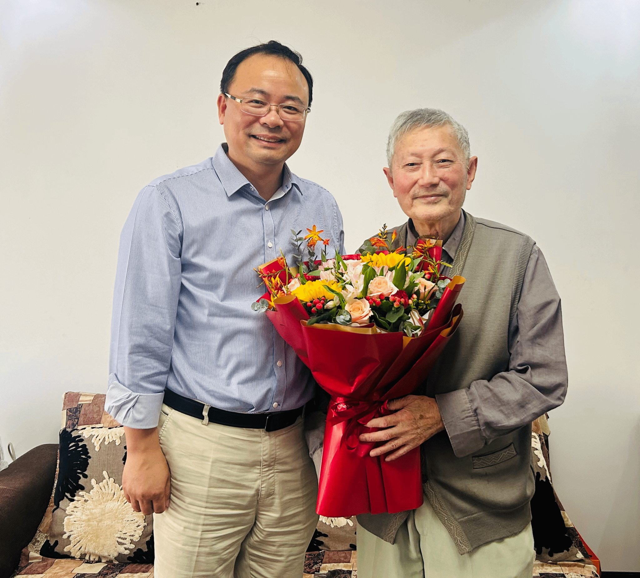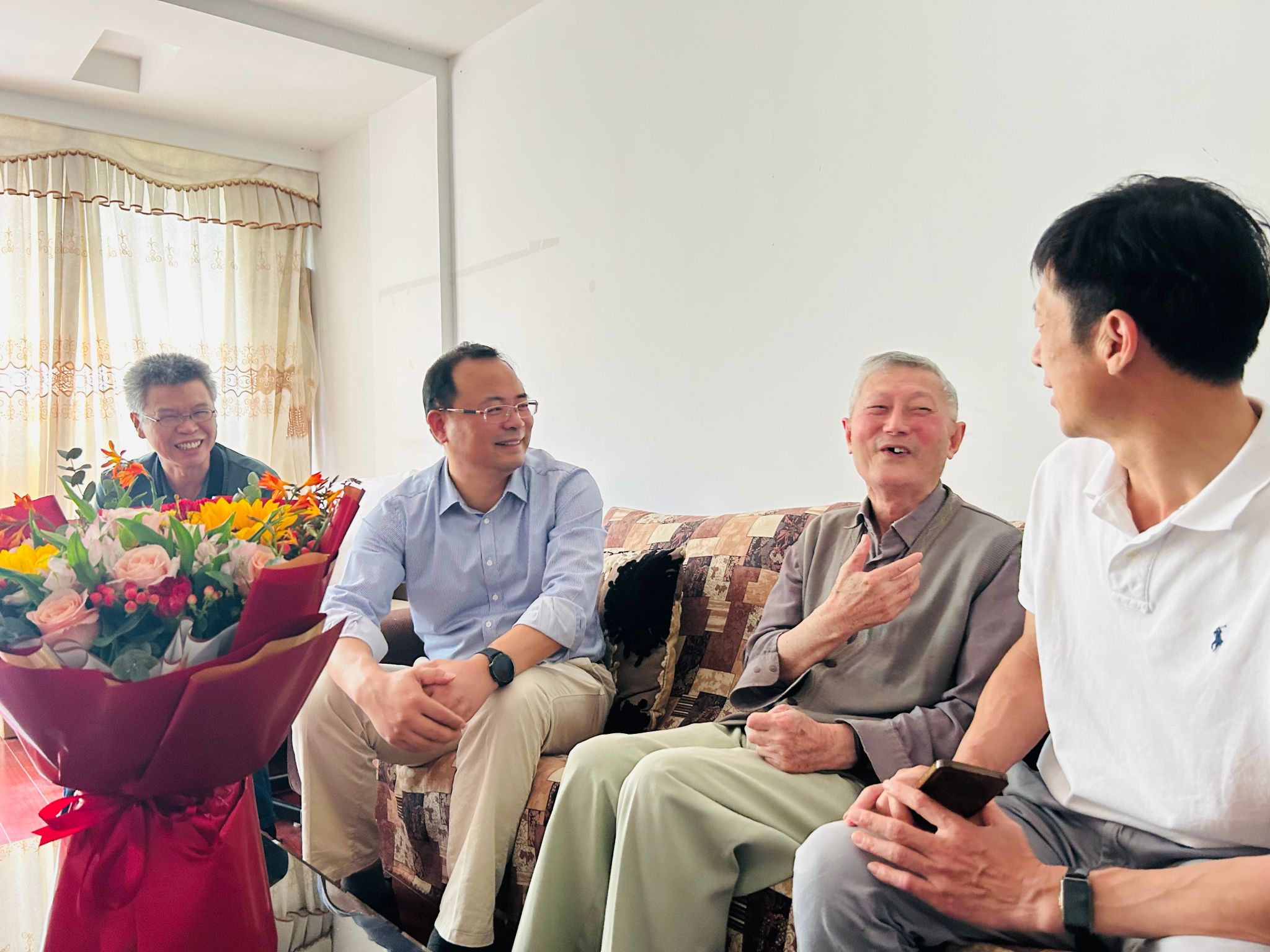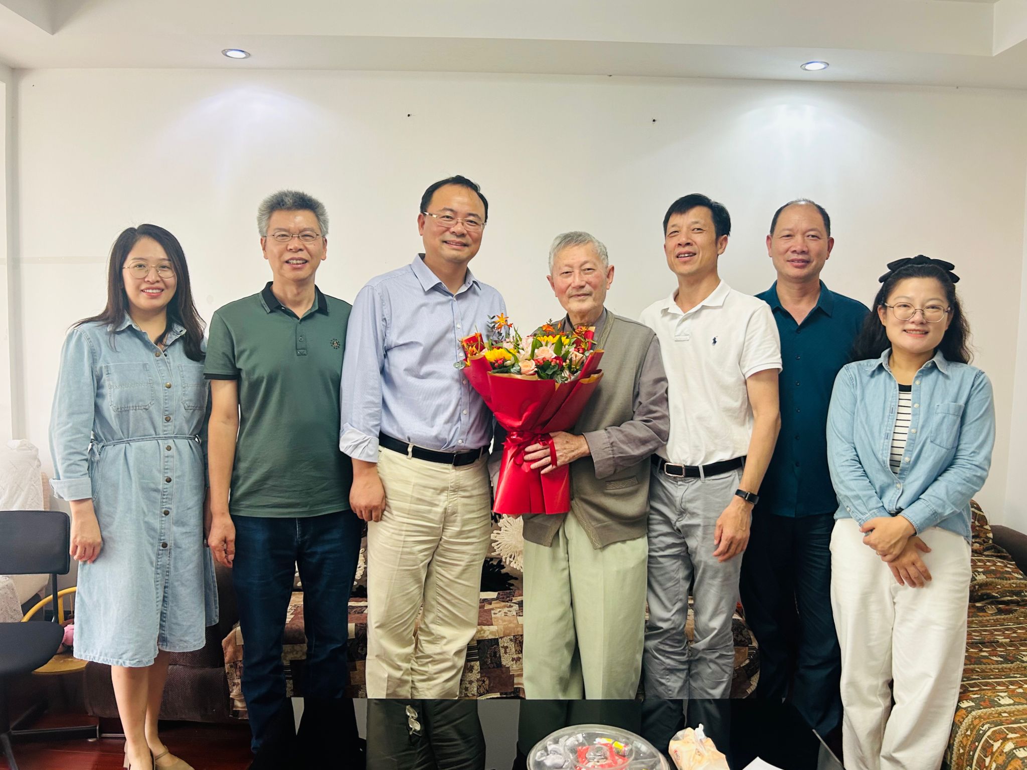 宁大花园喜气洋洋,耄耋老人精神矍铄。“祝您节日快乐!也祝您生日快乐。”李力行教授今年90岁,刚过大寿不久,身体硬朗、乐观豁达,王伦耀十分欣慰,关切询问他的日常生活、健康状况,感谢他为学院和学校作出的贡献,认真听取他的意见建议,王书记叮嘱学院随行相关人员要继续用心做好离退休服务工作,让老人生活更加安心、舒心。
