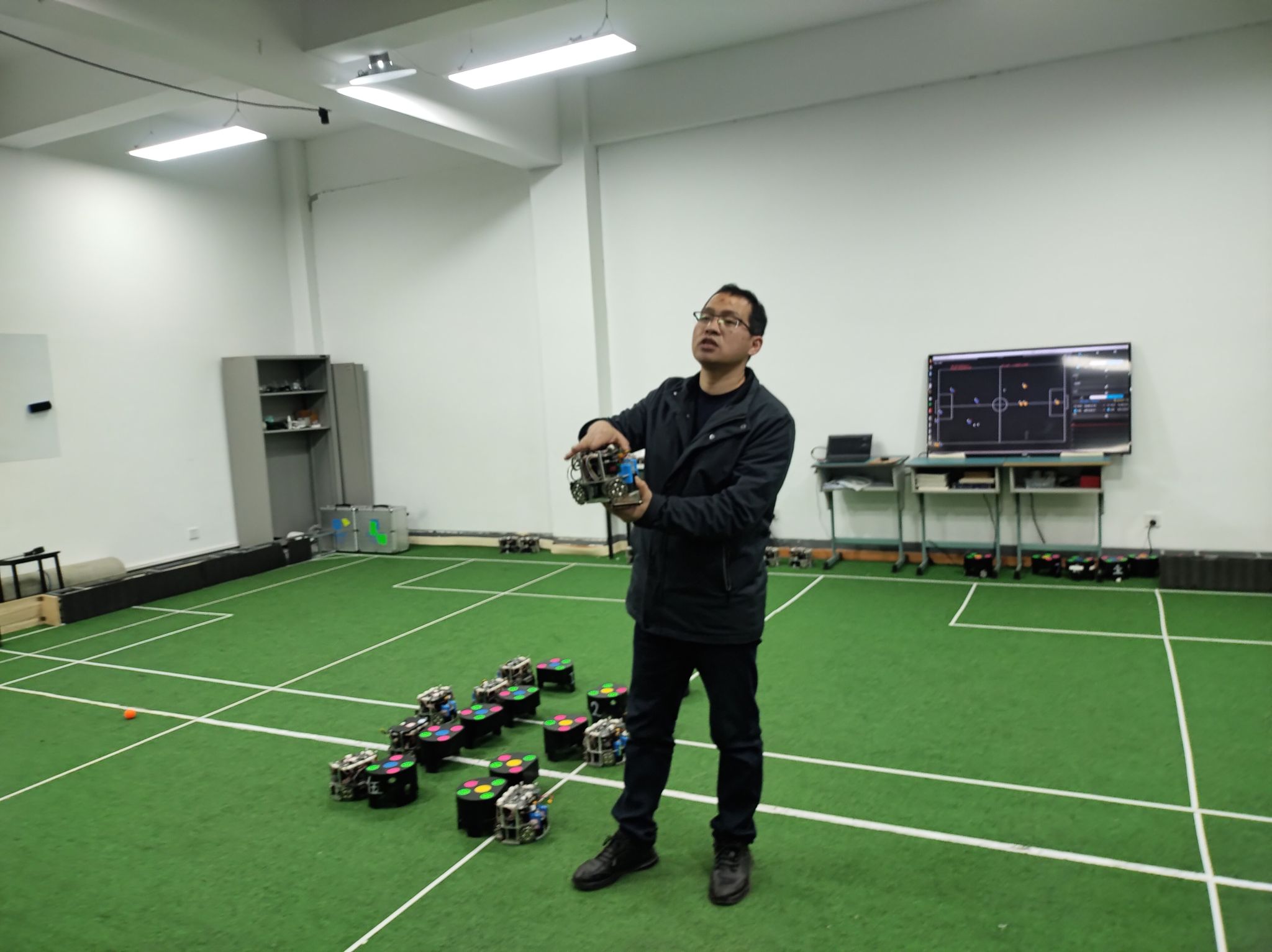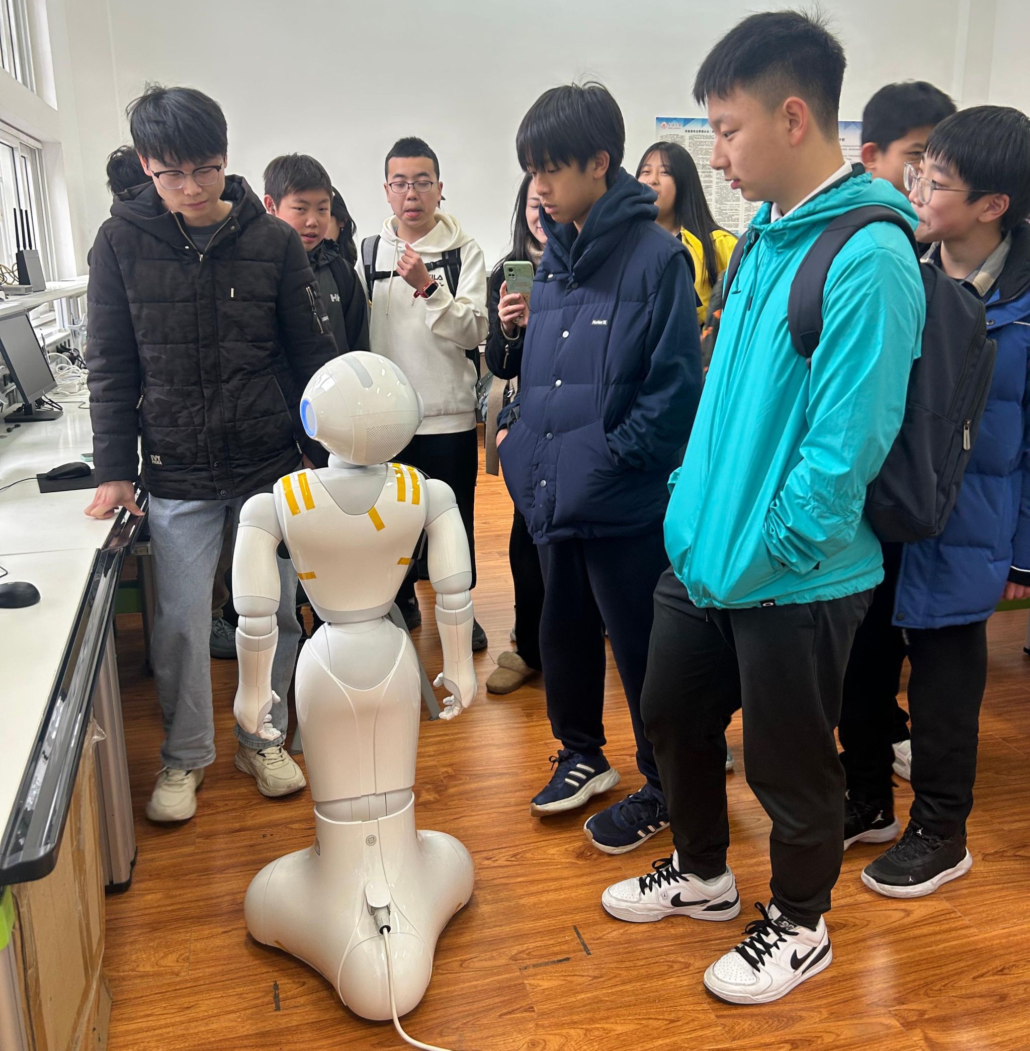 在人形机器人实验室,人形机器人的精彩表演让同学们大开眼界,它们不仅能够语音介绍信息学院的情况,还能流畅地打出一套完整的太极拳。学院老师详细介绍了机器人的构造、驱动原理以及人工智能算法在其中的应用,让同学们了解到这些看似神奇的机器人背后,是无数科研人员智慧与汗水的结晶。学院老师还组织了紧张刺激的机器人足球赛,指导同学们进行机器人编程体验。同学们三两成群,热烈讨论着编程思路,尝试通过编写代码控制机器人的行动。在一次次的尝试与调整中,同学们逐渐掌握了编程的基本技巧,感受到了编程的魅力与机器人技术的神奇之处。