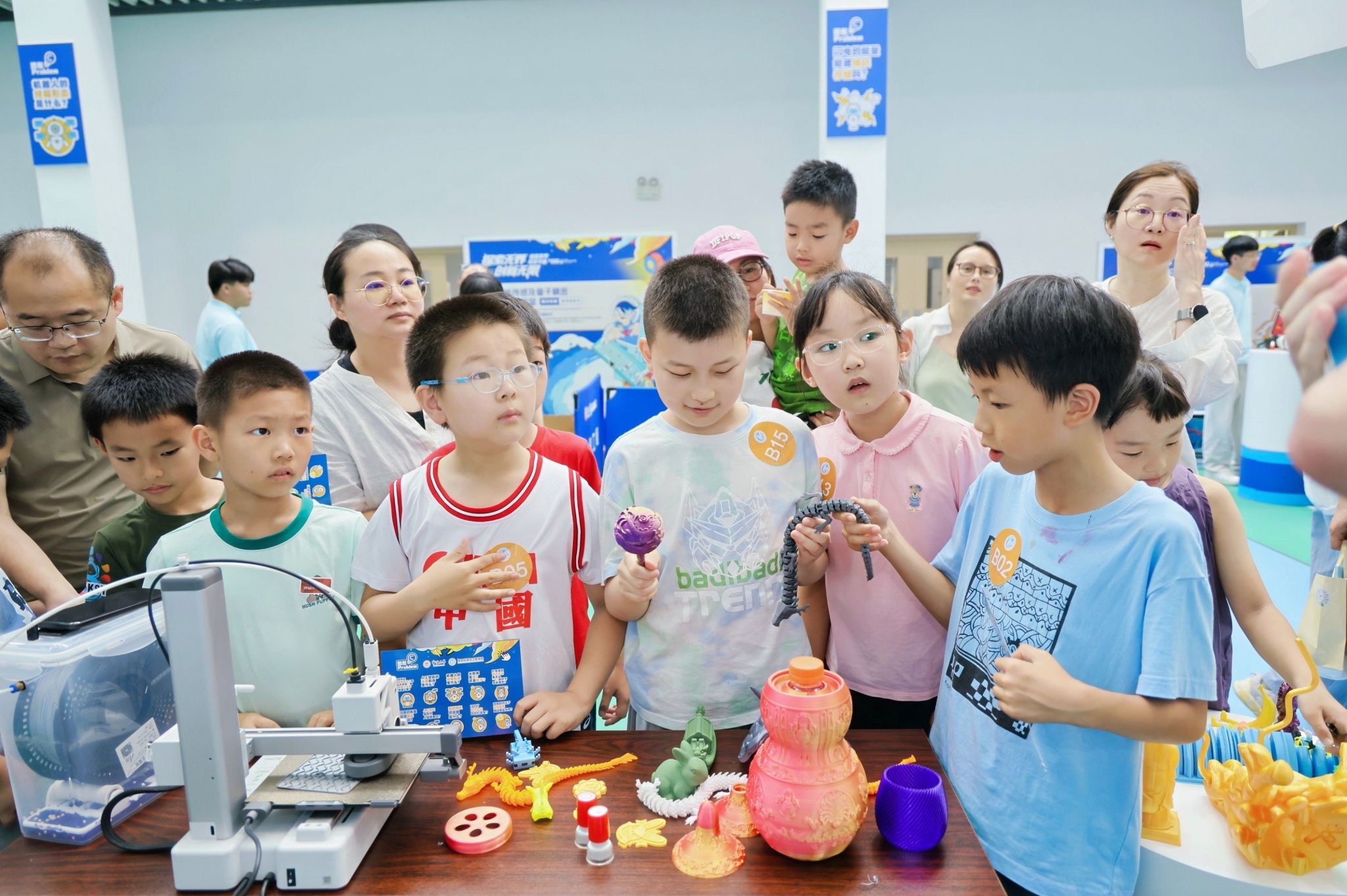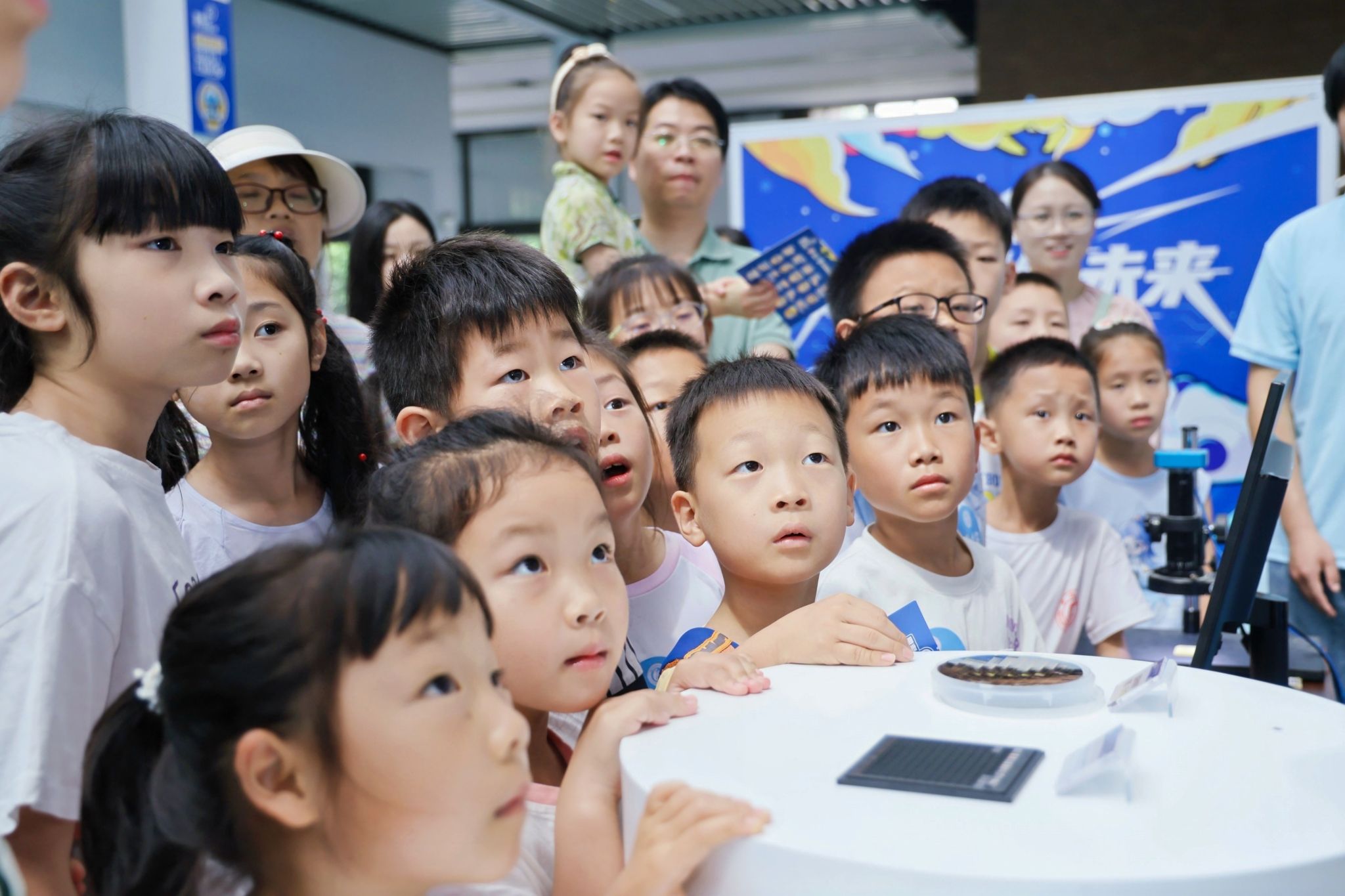 在展厅参观环节,孩子们在专业老师的带领下,走进“信息世界探索中心”,通过电子放大镜观察芯片内部结构,体验3D打印技术、AI垃圾分类和VR眼镜等前沿科技,初步领略了信息科学的魅力。