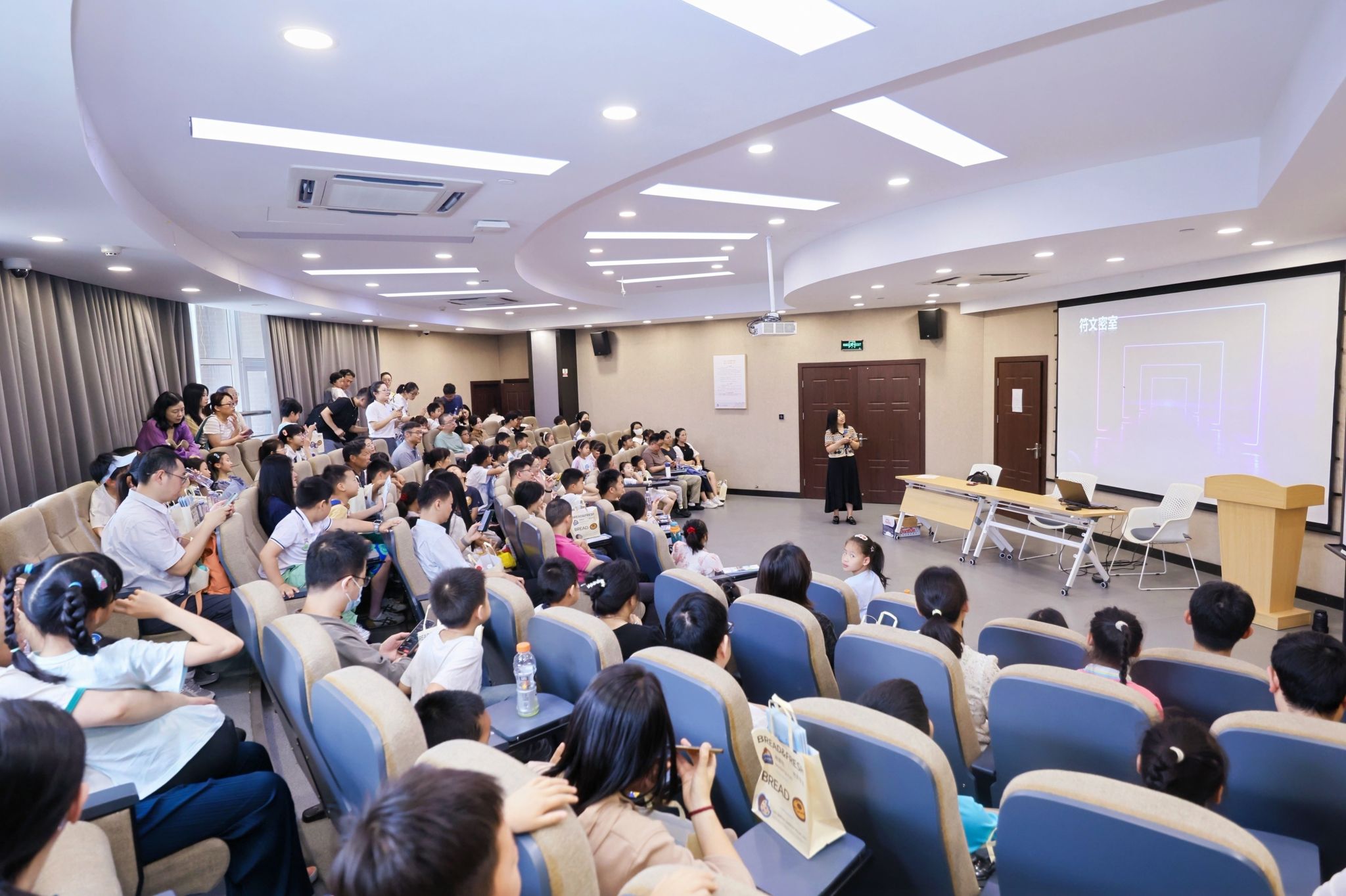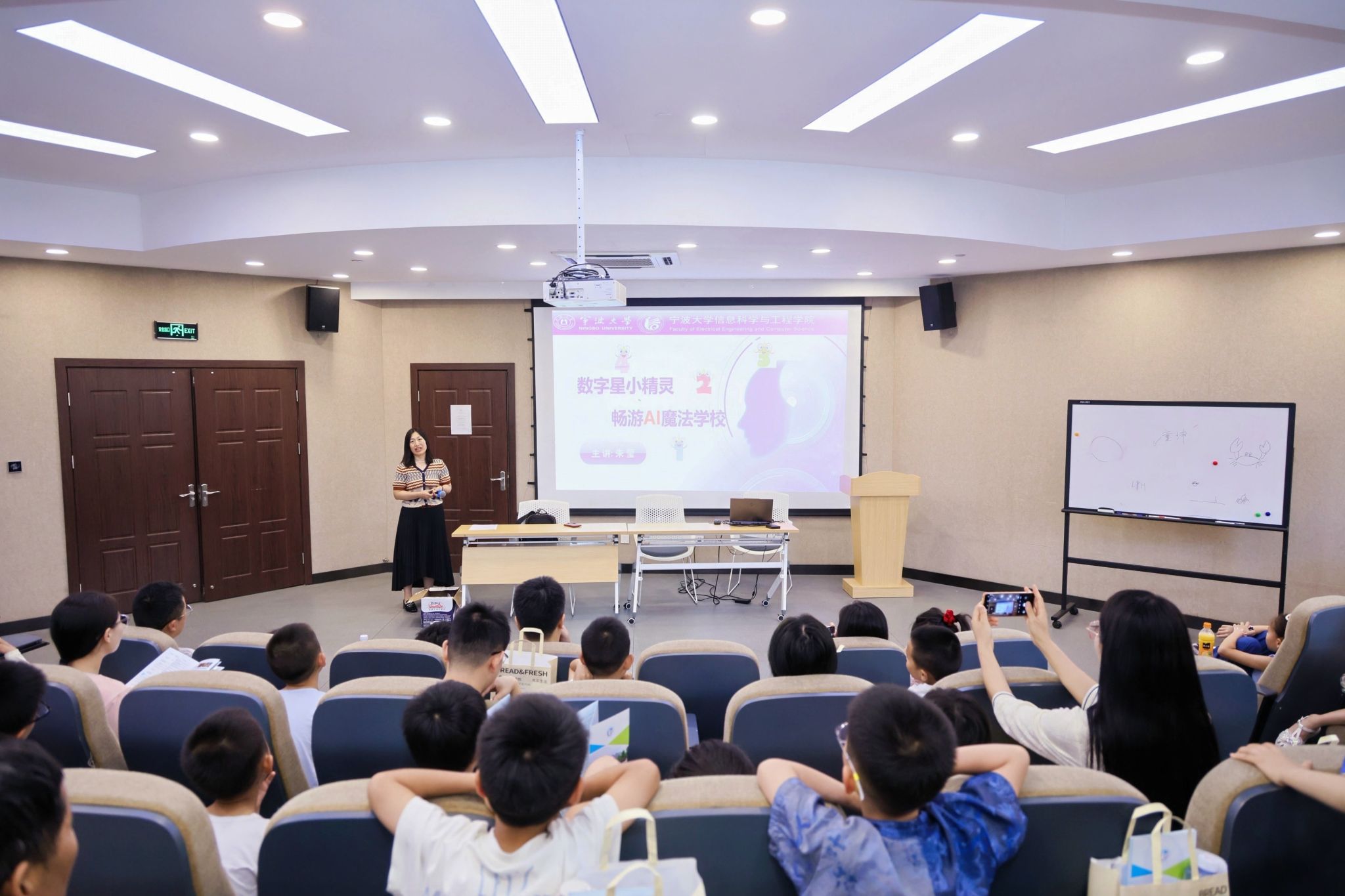 本次活动内容丰富,形式多样,分为科技大课堂、科普展厅参观、实验室体验及科技手工制作四个环节。在科技大课堂中,信息学院朱莹老师为孩子们带来了一场生动有趣的科普讲座——《数据星小精灵畅游AI智能魔法学院》,通过寓教于乐的方式,让孩子们了解了人工智能的核心原理。
