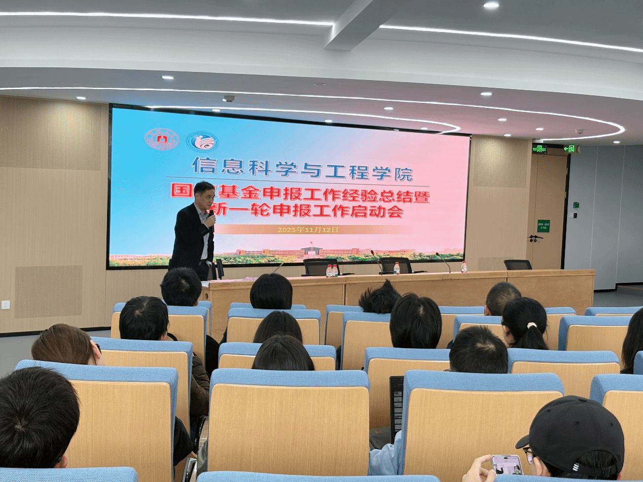 为扎实做好2026年度国家自然科学基金项目申报工作,有效提升项目质量与立项率。11月12日上午,信息学院在杨咏曼三楼报告厅组织召开2026年度国家自然科学基金项目申报辅导会。会议特邀浙江大学肖俊教授做专题辅导,学院领导班子成员、各系所骨干教师及拟申报基金项目的教师代表参会。会议由学院副院长王健主持。