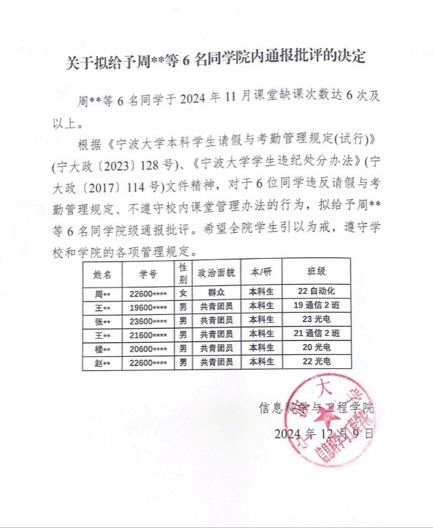 关于拟给予周**等6名同学院内通报批评的决定