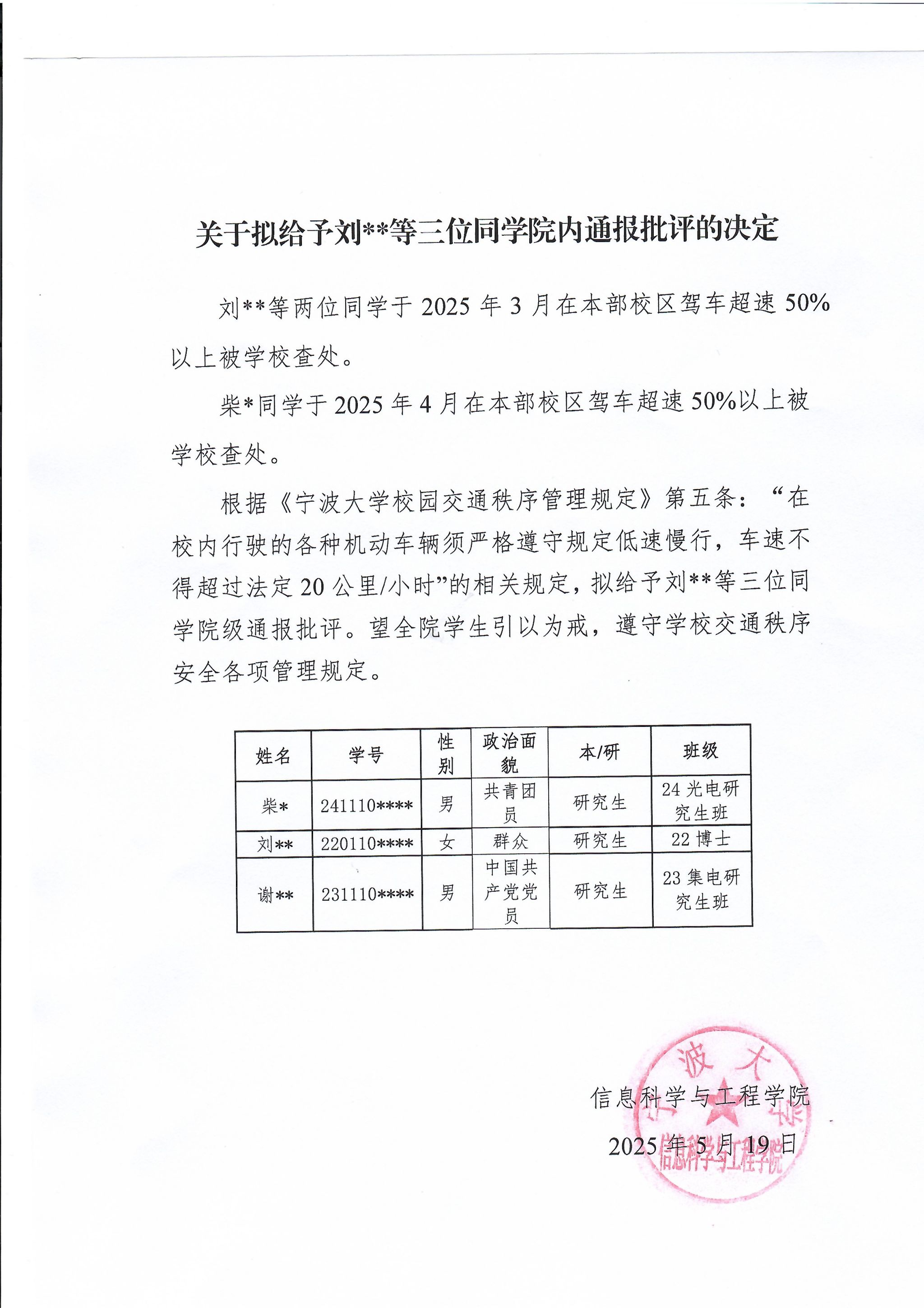关于拟给予刘**等三位同学院内通报批评的决定