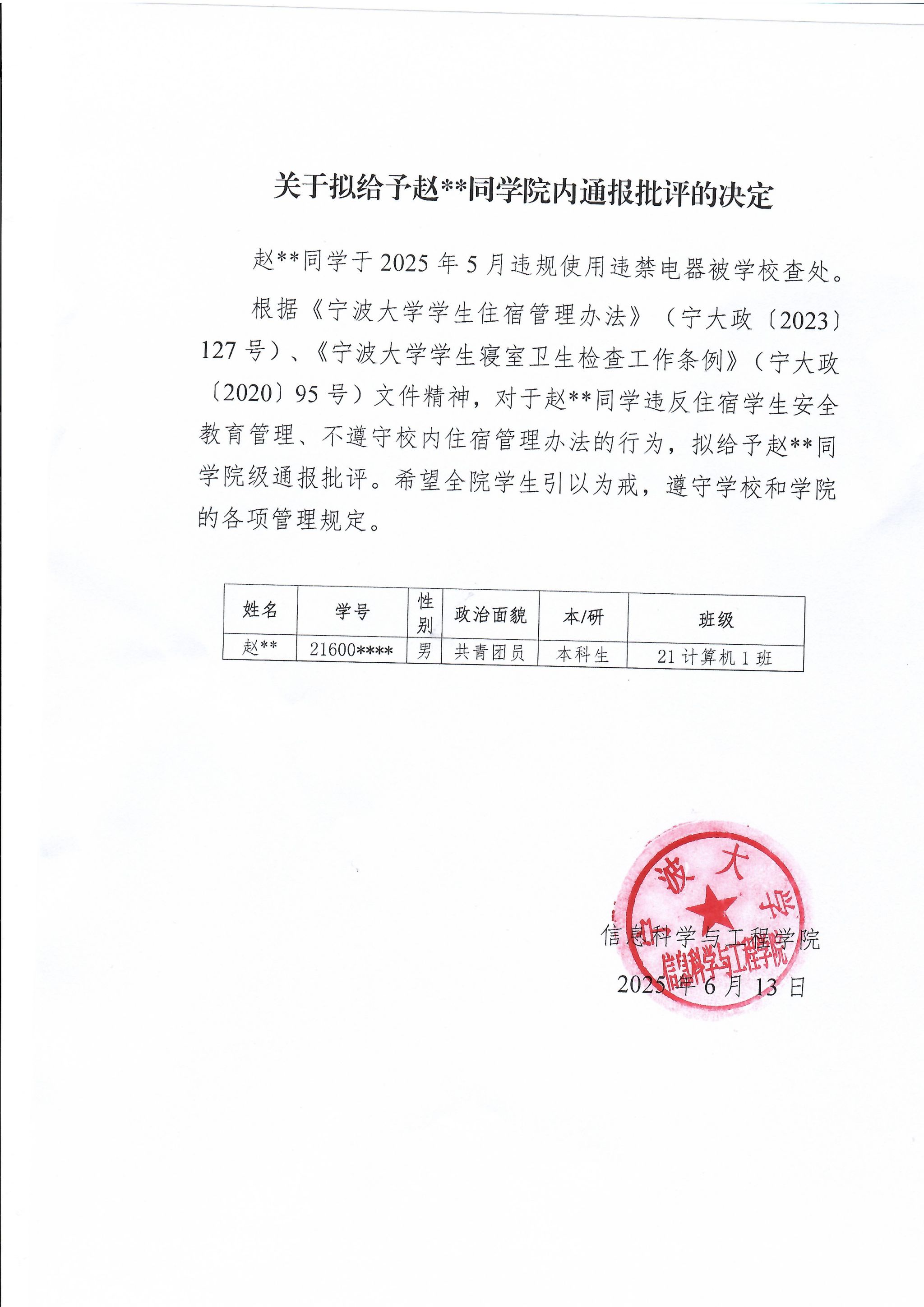 关于拟给予赵XX同学院内通报批评的决定