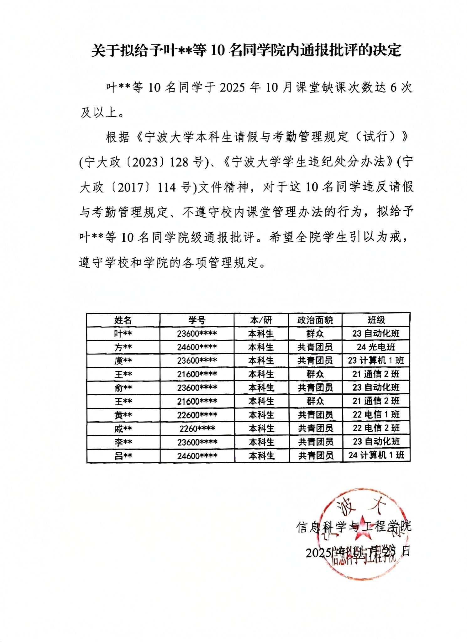 关于拟给予叶**等10名同学院内通报批评的决定