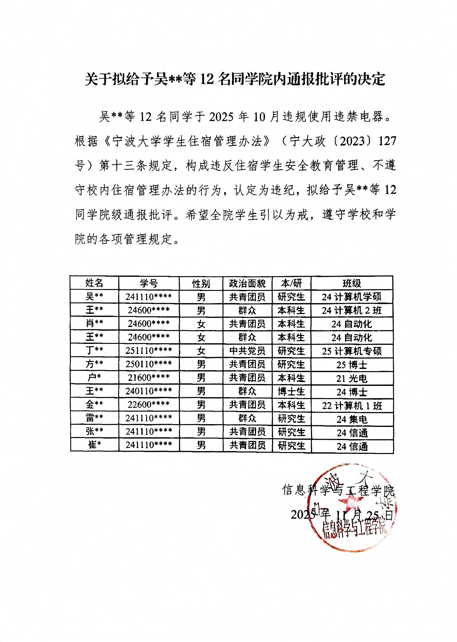 关于拟给予吴**等12名同学院内通报批评的决定