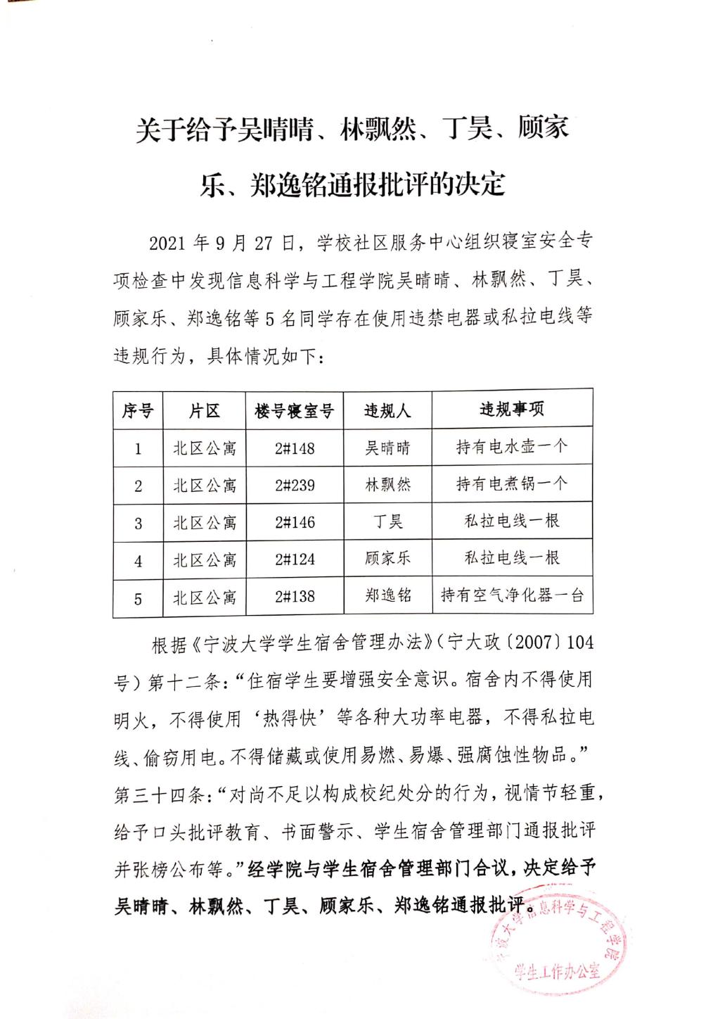 关于给予吴晴晴、林飘然、丁昊、顾家乐、郑逸铭通报批评的决定
