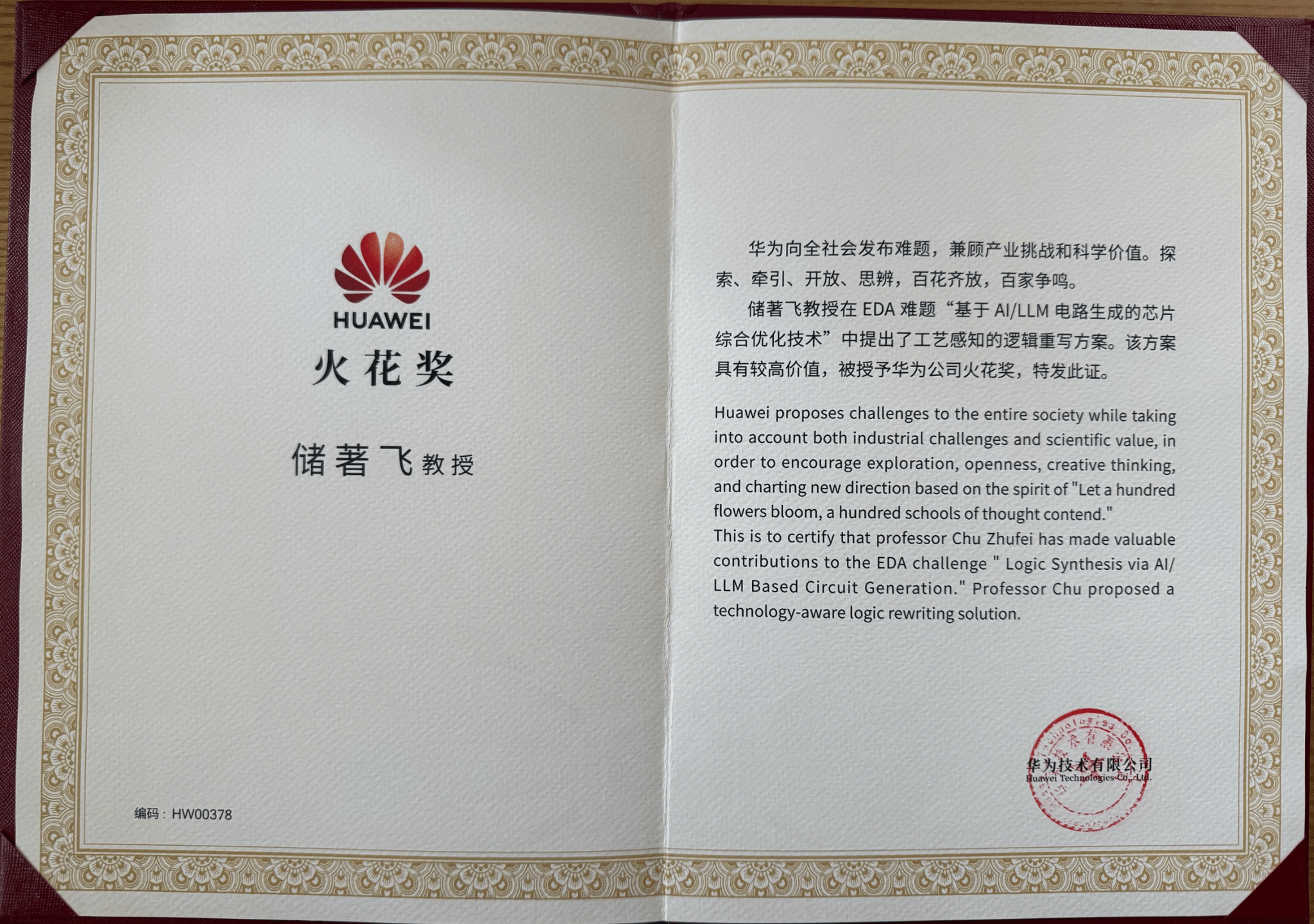 储著飞教授应邀出席了在深圳举行的华为公司“难题揭榜”火花奖颁奖典礼,并参加了华为创始人任正非组织的交流座谈会,华为董事、2012实验室主任查钧等为获奖者颁发了奖项。储著飞教授在芯片电子设计自动化(EDA)难题“基于AI/LLM电路生成的芯片综合优化技术”中提出了工艺感知的逻辑重写方案,具有较高理论和应用价值,被授予华为公司火花奖。