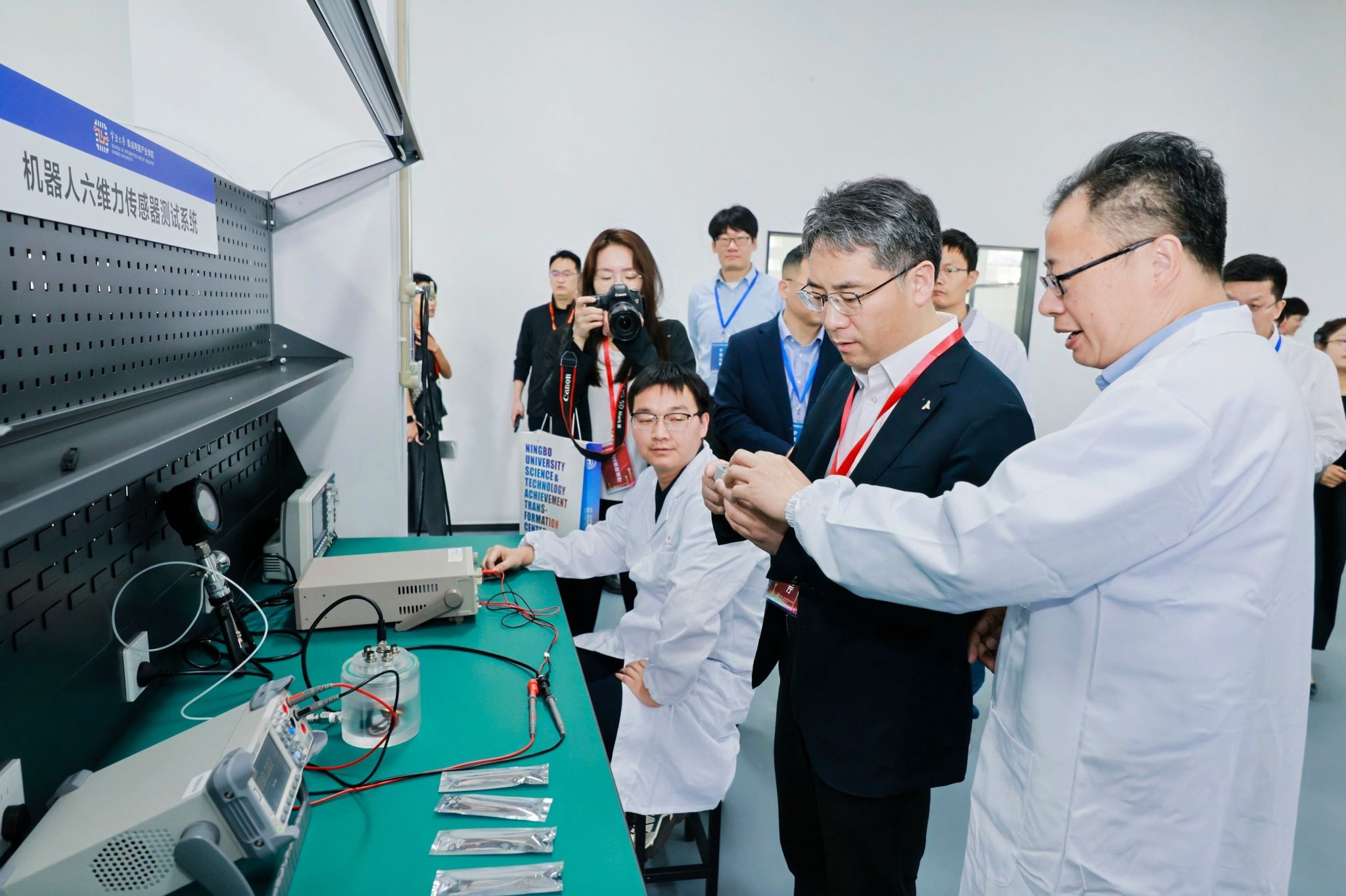 产业学院入驻团队代表、先进智能传感技术团队负责人金庆辉教授带领陈峰一行参观团队研发工作区。该团队是从事国内气体传感器、微纳传感器的创新科研团队。主要在机器人六维力传感器技术、新能源车动力电池状态传感技术等方面有诸多技术突破,承担了多项军委科技委、国家科技部重大专项项目。该团队近几年积极服务智能制造相关产业需求,与中国一汽车集团有限公司、宁波水表集团、宁波均胜电子汽车研究院等多家单位开展产学研工作,已独立孵化宁波九章电子有限公司助力成果转化,为产业发展注入宁大智慧。